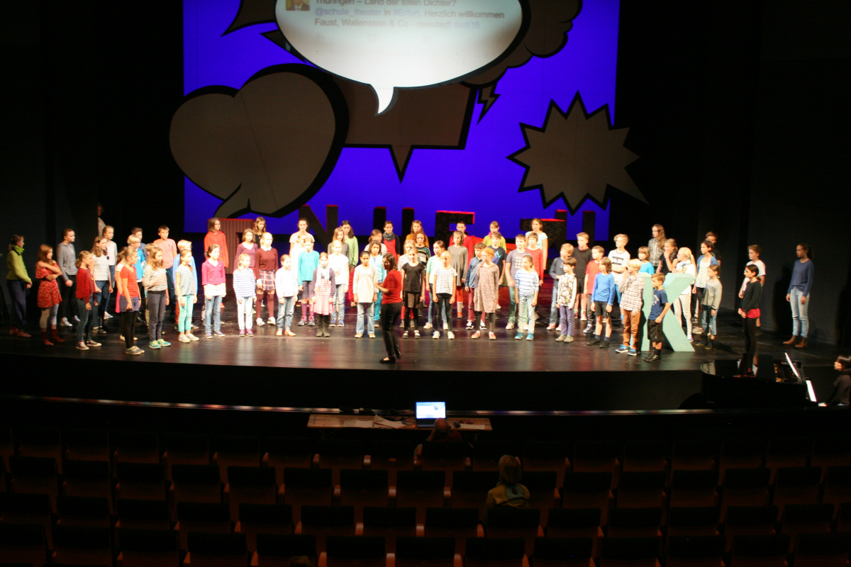 Der Kinderchor der schola cantorum weimar singt im Rahmen der Eröffnungsveranstaltung der Schultheatertage der Länder auf der Bühne des Theater Erfurt.