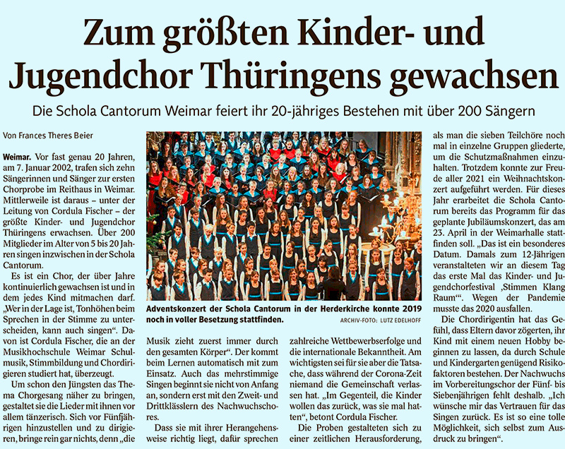 Zeitungsartikel zum 20-jährigen Bestehen der schola cantorum weimar in TA und TLZ von Frances Theres Beier