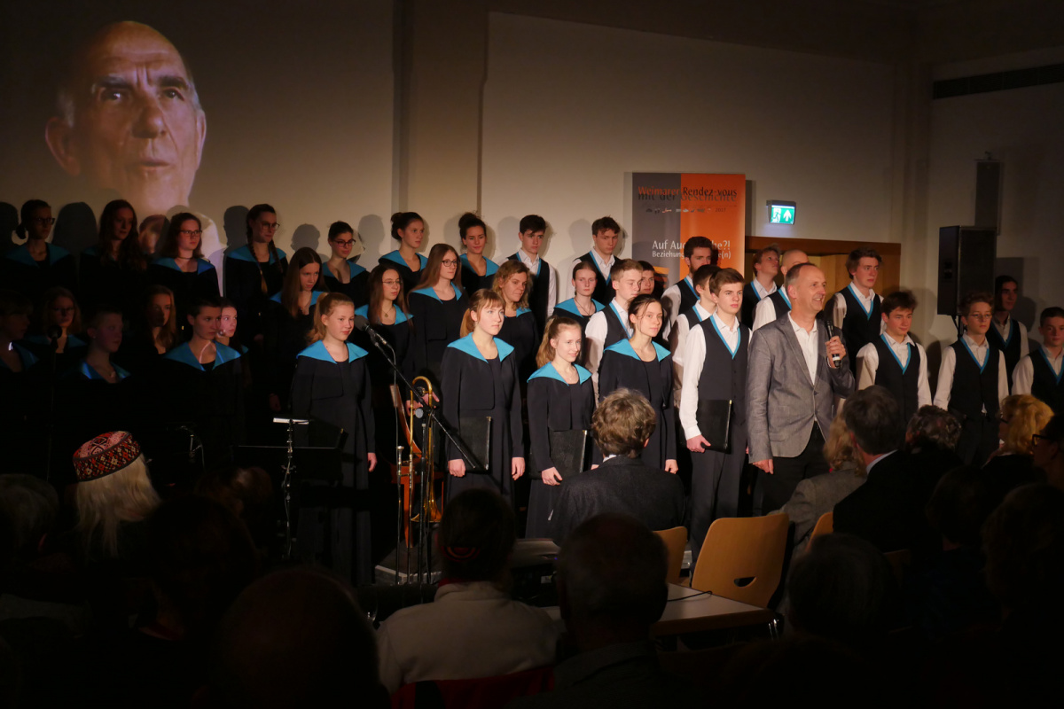 Der Jugendchor der schola cantorum weimar sang am 12. November zur Abschlussveranstaltung des Festivals "Weimarer Rendez-vous mit der Geschichte". Anlässlich des 100. Geburtstages von Stéphane Hessel lasen Regine und Detlef Heintze Gedichte, die für Stéphane Hessel während seiner Gefangenschaft zu einer Kraftquelle des Überlebens wurden und an diesem Abend eine Brücke bildeten, die allen Anwesenden eine besondere Blick auf sein Leben öffneten.
