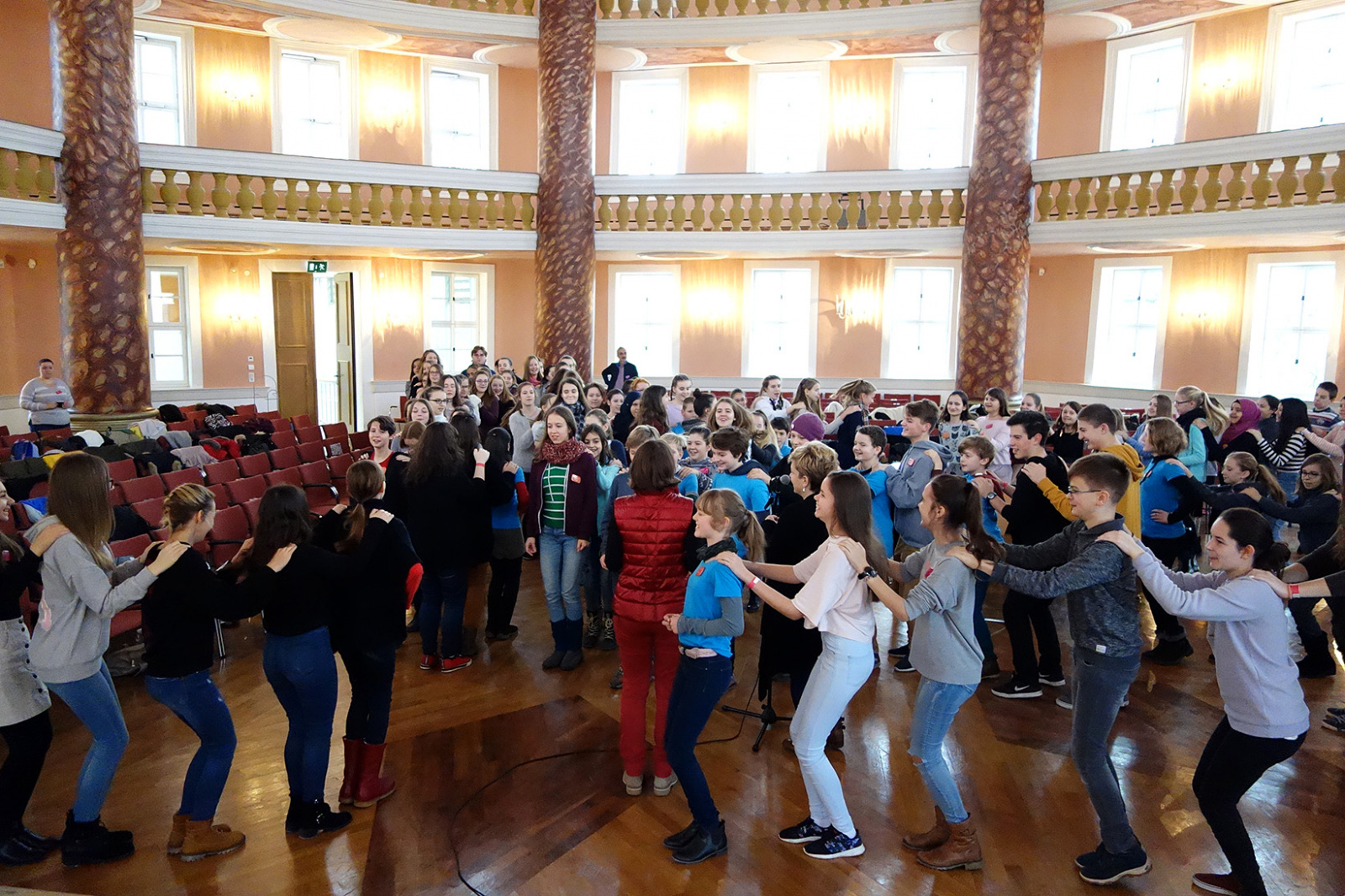 Crucius Kirche Sondershausen -Kinderchor der schola cantorum weimar, Bild: Foto: Lena-Marie Forkel Vom 29. November bis zum 3. Dezember 2017 war der Kinderchor der schola cantorum weimar Gast beim internationalen Kinderchorfestival "Reich’ mir die Hand und lass uns seh’n, wie Töne über Grenzen geh’n!" an der Thüringer Landesmusikakademie in Sondershausen. Mit uns nahmen noch zwei Kinderchöre aus Ungarn teil: der "Lautitia Childrens Choir" aus Debrecen und "Kos Gyermekkar "aus Budapest. Die fünf Festivaltage waren gefüllt mit gemeinsamen Proben zum Erlernen mehrerer Chorwerke in deutscher und ungarischer Sprache, einem bunten Freizeitprogramm, gelungenen Chorbegegnungen mit neuen Freunden, Tanz und Spiel. Alle Chöre sagen Konzerte in Sondershausen und Umgebung (u.a. Kloster Volkenroda) und beendeten das Festival mit einem brillianten Abschlusskonzert im Achteckhaus der Landesmusikakademie Sondershausen.