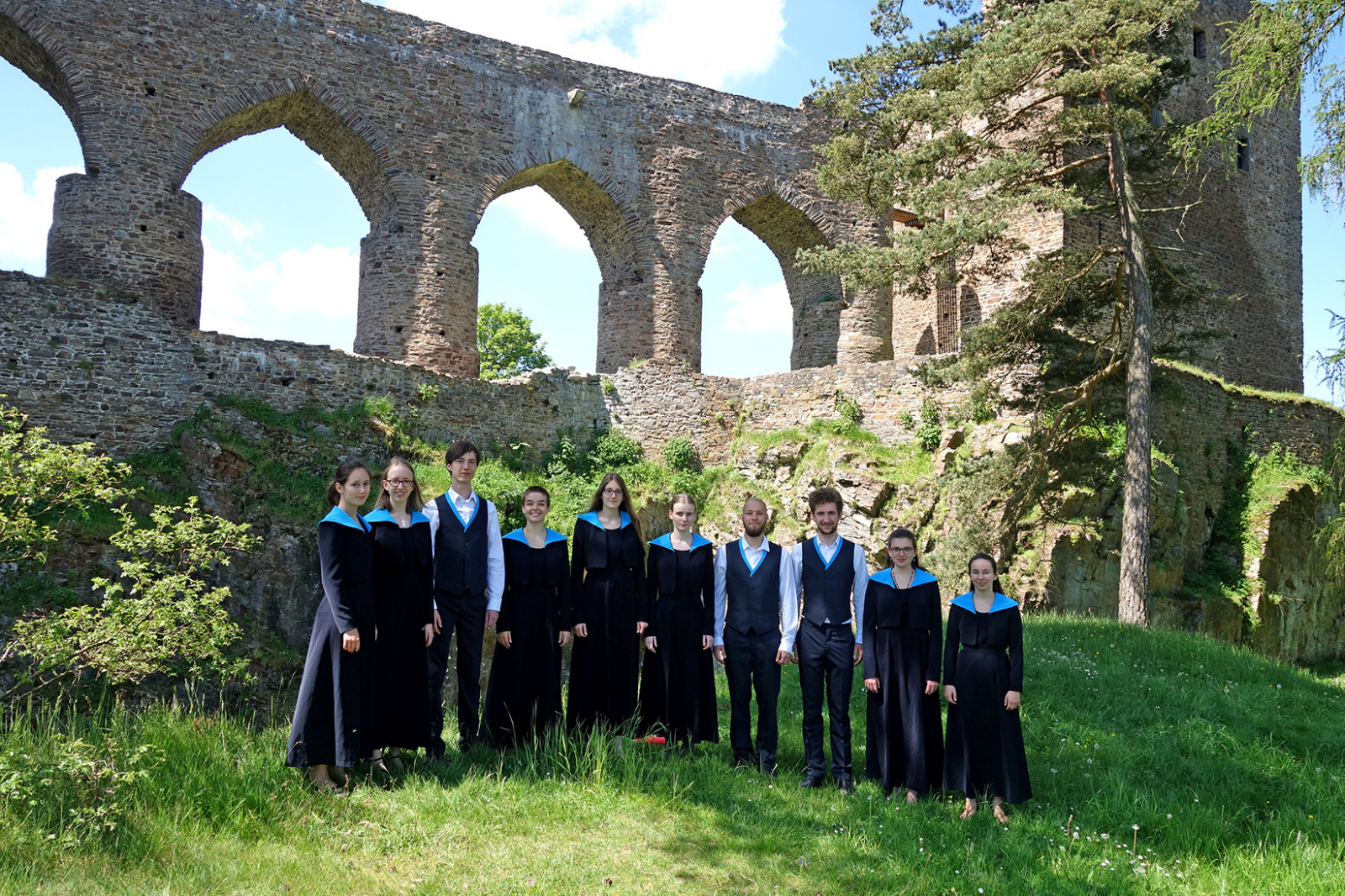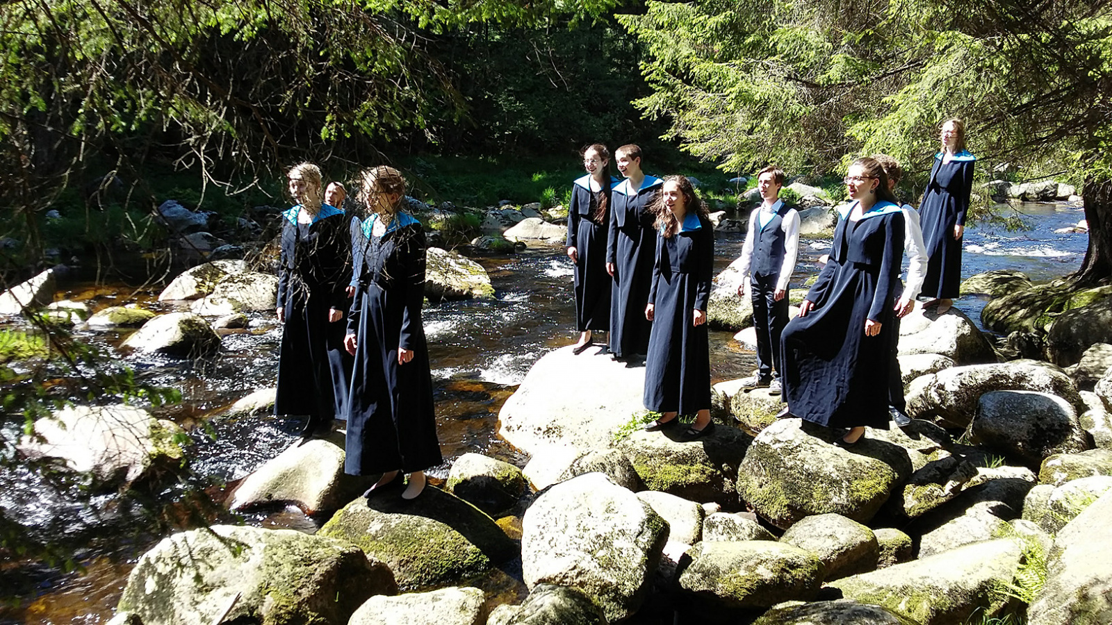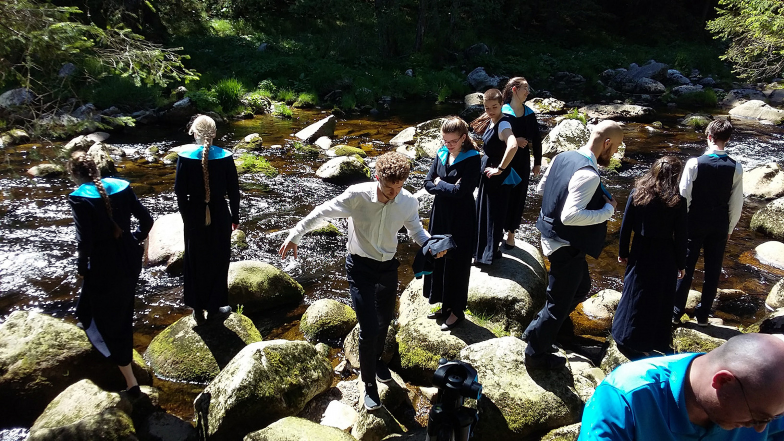 Jugendkammerchor der schola cantorum weimar beim "XXI. Evropský festival duchovní hudby", Bild: Foto: Sebastian Göring Zum 450. Geburtstag von Claudio Monteverdi (1567-1643) veröffentlichte der Jugendkammerchor der schola cantorum weimar sein aktuelles Musikvideo: «Adoramus te, Christe» aus dem Jahr 1620 für sechs Stimmen. Während der Konzertreise nach Tschechien im Mai 2017 nutzen die Sängerinnen und Sänger die wundervolle Natur und die historischen Burgen, Schlösser und Kirchen als Drehorte. Bei den kleinen Wanderungen zum Drehort bekamen die jungen Sängerinnen und Sänger immer neugierige Blicke von Touristen. Zurecht! Wann sieht man schon einen Chor in schicker Konzertkleidung durch Wald und Wiese wandern und im Wasser oder auf Brücken stehend strahlende Renaissance Musik singen?! Als Musikensemble aus Weimar darf natürlich auch eine Szene im Ilmpark nicht fehlen.