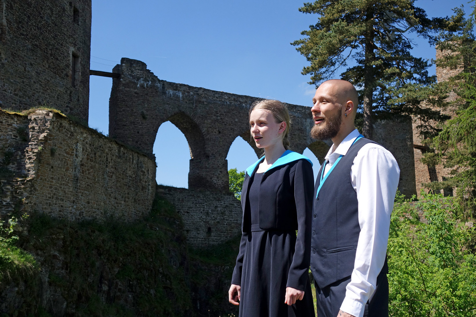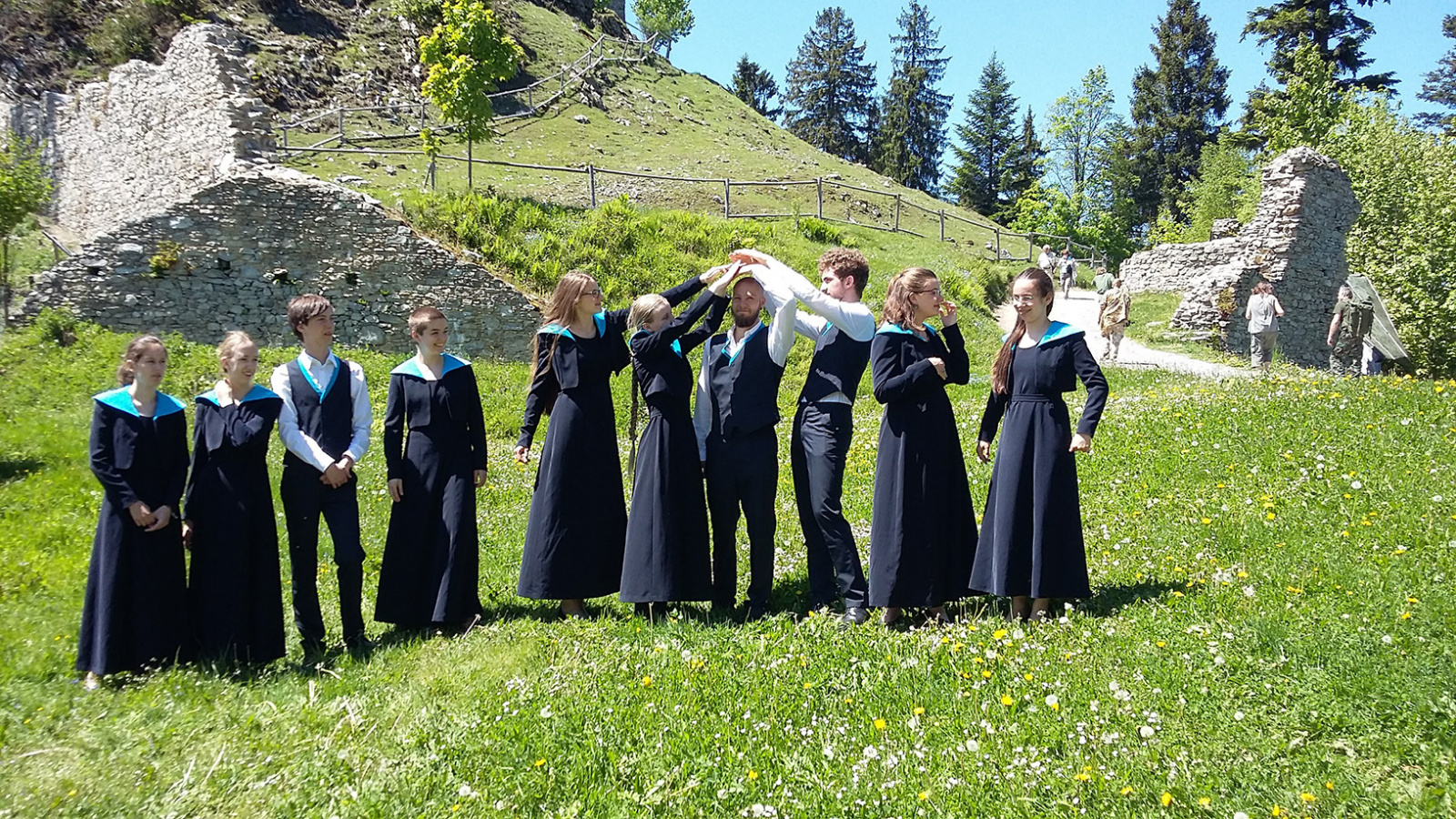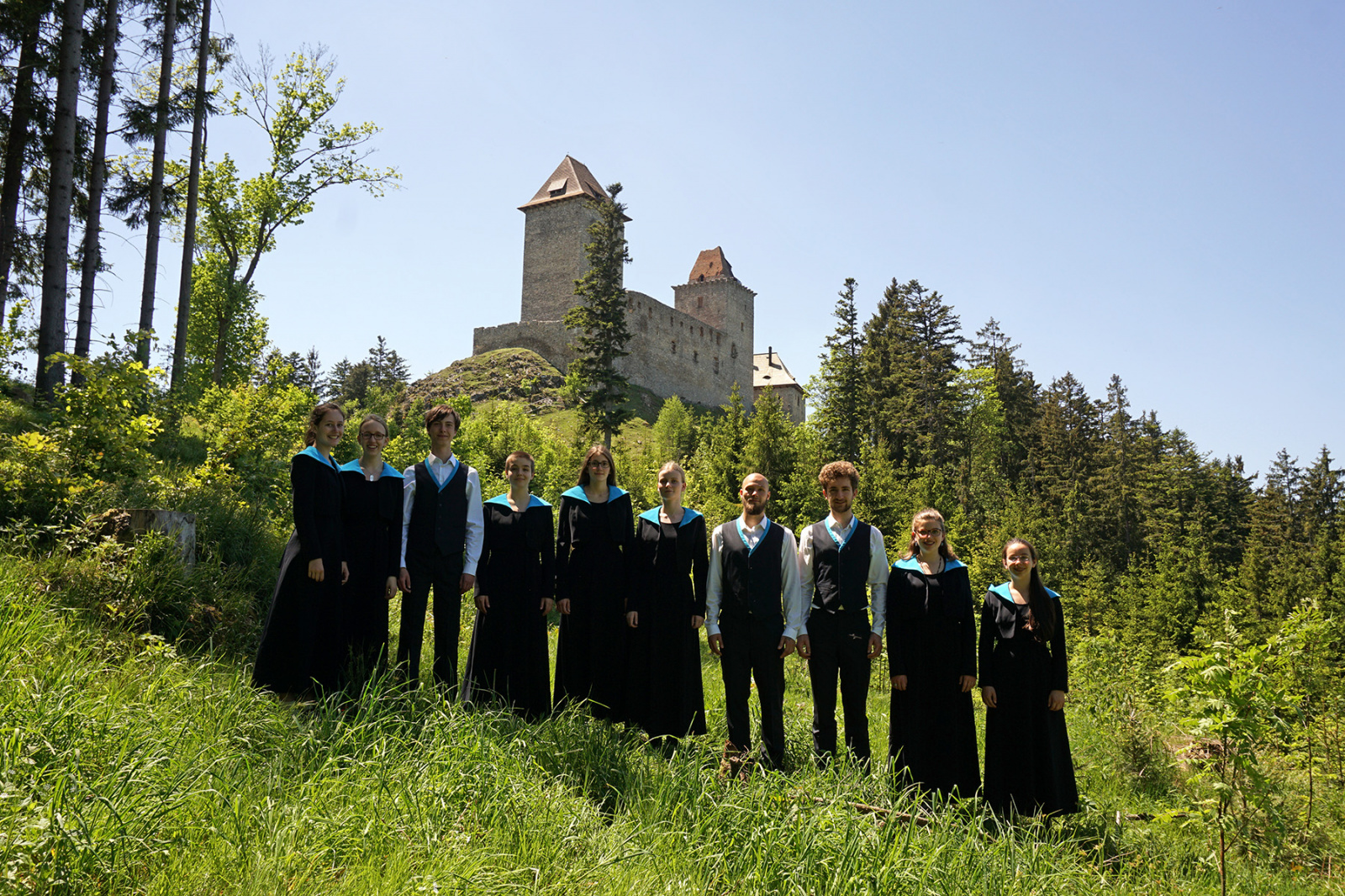 Jugendkammerchor der schola cantorum weimar beim "XXI. Evropský festival duchovní hudby", Bild: Foto: Sebastian Göring Zum 450. Geburtstag von Claudio Monteverdi (1567-1643) veröffentlichte der Jugendkammerchor der schola cantorum weimar sein aktuelles Musikvideo: «Adoramus te, Christe» aus dem Jahr 1620 für sechs Stimmen. Während der Konzertreise nach Tschechien im Mai 2017 nutzen die Sängerinnen und Sänger die wundervolle Natur und die historischen Burgen, Schlösser und Kirchen als Drehorte. Bei den kleinen Wanderungen zum Drehort bekamen die jungen Sängerinnen und Sänger immer neugierige Blicke von Touristen. Zurecht! Wann sieht man schon einen Chor in schicker Konzertkleidung durch Wald und Wiese wandern und im Wasser oder auf Brücken stehend strahlende Renaissance Musik singen?! Als Musikensemble aus Weimar darf natürlich auch eine Szene im Ilmpark nicht fehlen.
