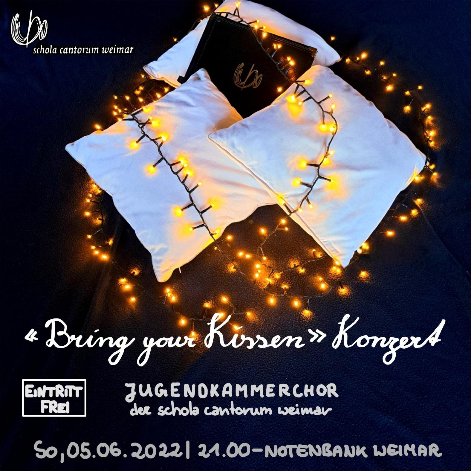 Am Abend ist der Jugendkammerchor dann noch einmal in Weimar zu hören. Das ebenso innovative wie kultige Konzertformat «Bring your Kissen» geht damit in die nunmehr achte Runde. Geprägt hat dieses Format der Jugendkammerchor der schola cantorum weimar unter der Leitung von Sebastian Göring. Dabei ist der Name Programm: bei Tee und Naschwerk lauscht das Publikum auf selbst mitgebrachten Kissen, Sitzpolstern oder Matratzen den Klängen des Chores. Stühle stehen zur Verfügung.