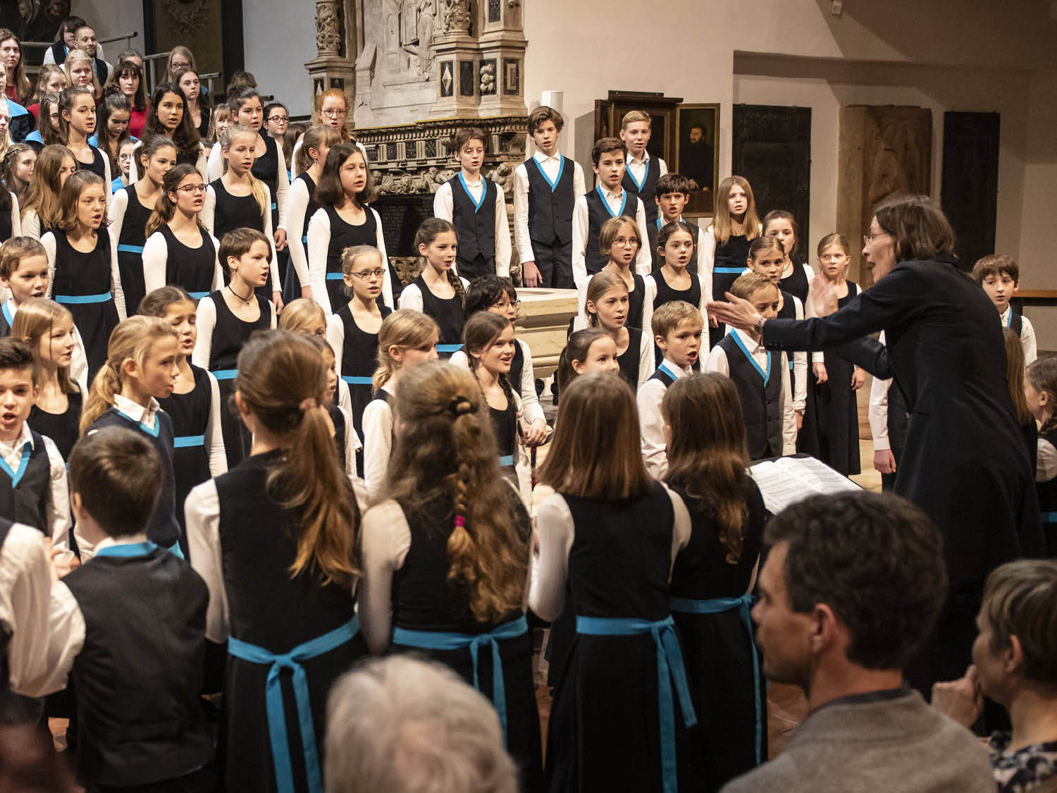 Am Samstag, den 7. Dezember 2019, sangen unsere Vorbereitungs- und Nachwuchschöre ihr Adventskonzert erstmals in der ausverkauften Katholischen Kirche »Herz Jesu« in Weimar. Dafür probten die knapp über 100 Fünf- bis Siebenjährigen fleißig das wunderbare Singspiel »Daniel, eine Weihnachtsgeschichte mit Liedern« nach einem Buch von Gerda Bächli und Sita Jucker. Der Hirtenjunge Daniel erlebt gemeinsam mit einem schlauen Esel und einem hellsichtigen Ochsen das Wunder der Weihnacht. Vorgelesen wurde die Geschichte vom Weimarer Puppenspieler Henning Hacke.